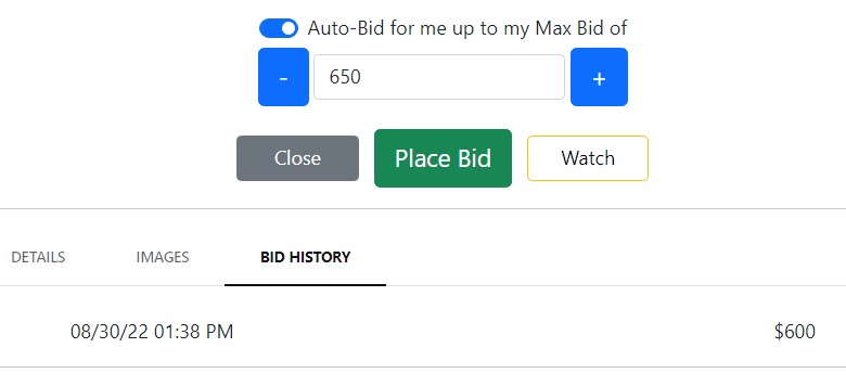 Below is the bidding screen that is displayed to attendees on iBid. On iBid, there are many tools to help increase bid amounts, a few being the "watch" button. This will send notifications to the bidder whenever there is activity on the item they are watching, enticing them to outbid any other bids. Another feature is Auto-Bid. Bidders can set a max bid to an item, and whenever they are outbid, the system will automatically bid on their behalf.